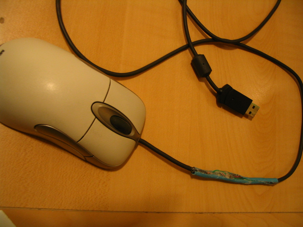 So I'd decided to fix it and get the mouse working again, so after cutting the wire in half to remove the damaged portion and then soldering it back together, it was good as new!